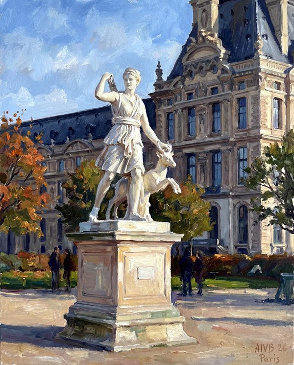 Paris neu erfunden, ein Park mit der Statue der griechischen Göttin Artemis. Es handelt sich um eine Art Selbstporträt (humorvolle Anspielung). Das Gemälde wurde 2025 begonnen und 2026 fertiggestellt.