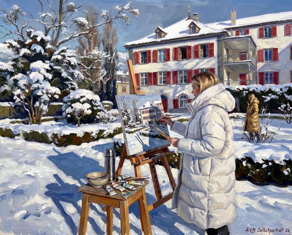Porträt von Natascha Vallelian in Arosa, Winter 2025-26, Öl auf Leinwand. Eigentum von Natalia A.N.