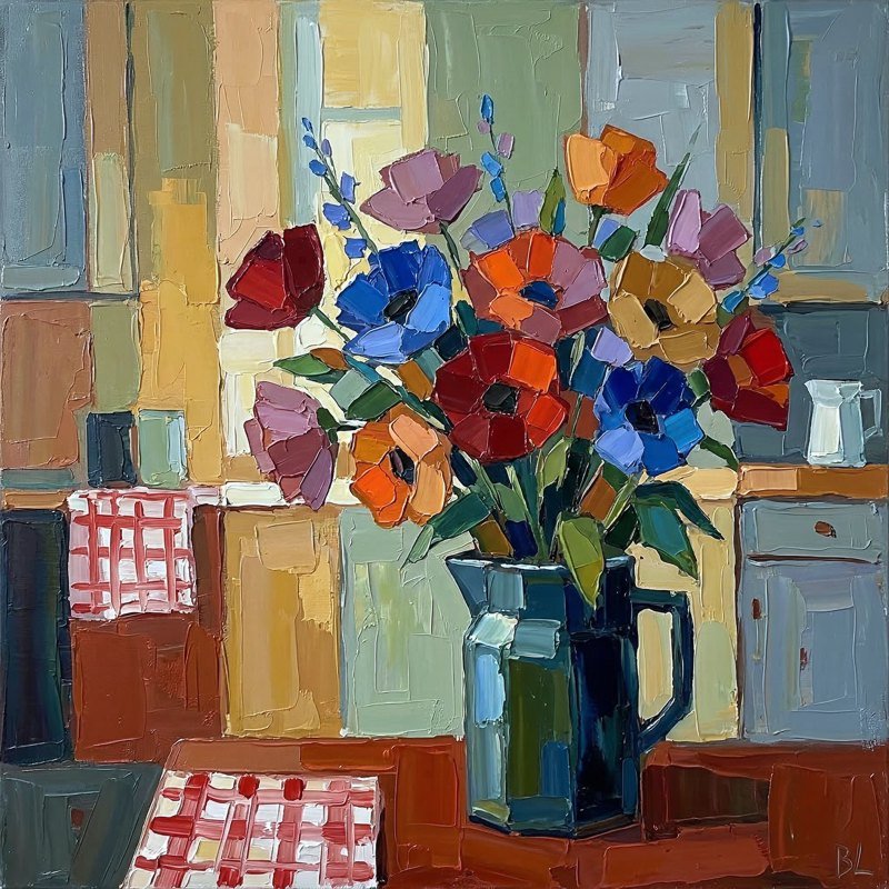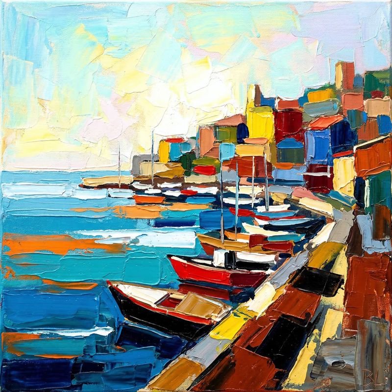 certains artistes construisent dans la tension, comme par exemple Nicolas de Staël, elle installe une forme de lenteur, une douceur presque méditative. Le couteau, qu’elle utilise également, ne sert pas ici à brusquer la matière, mais à la déposer avec précision, dans un geste mesuré.