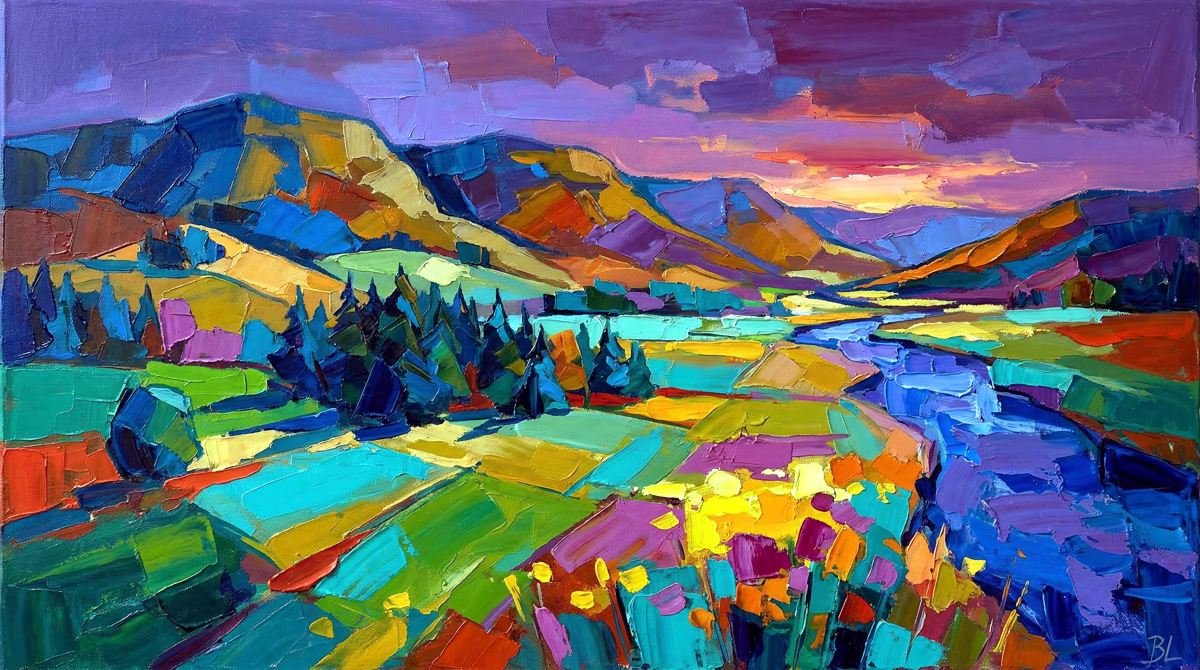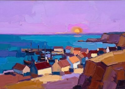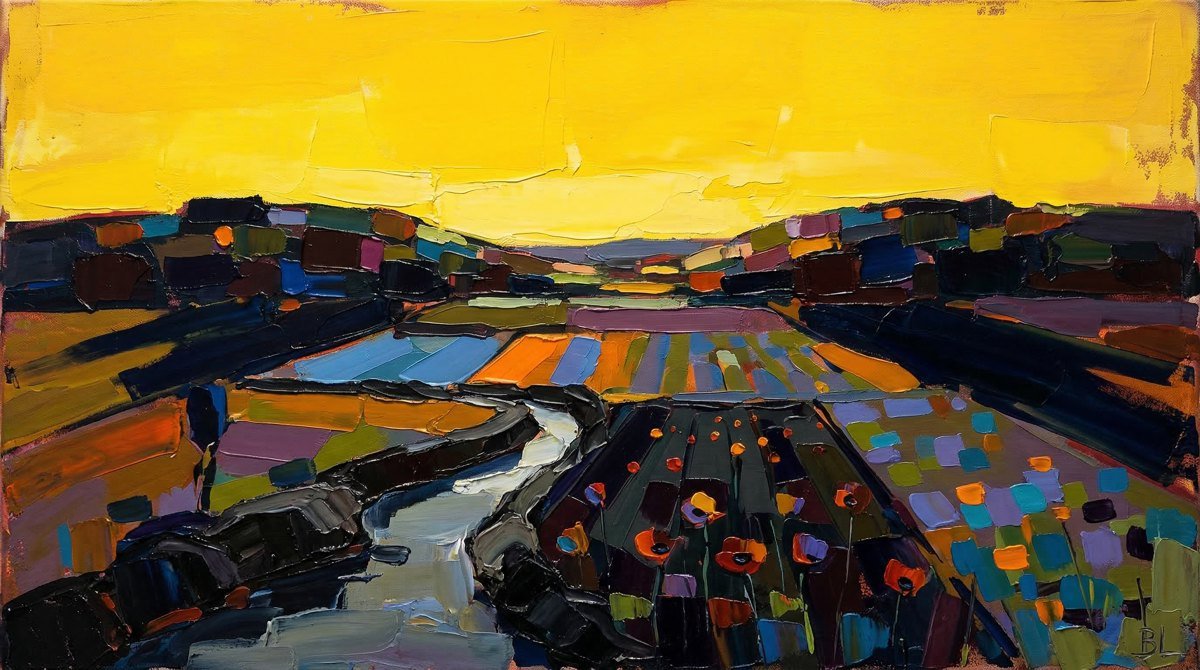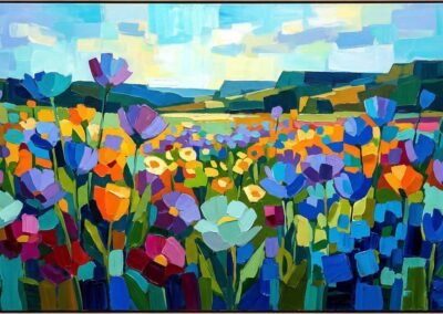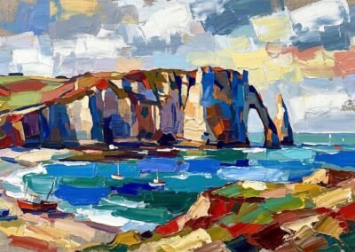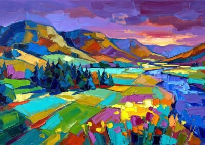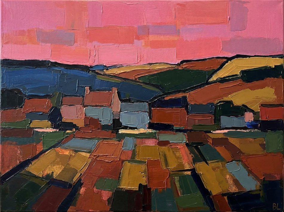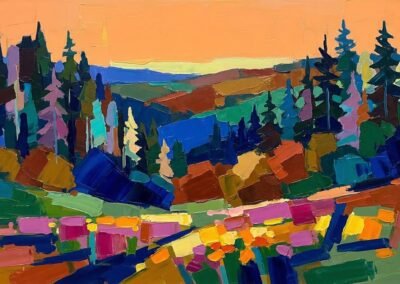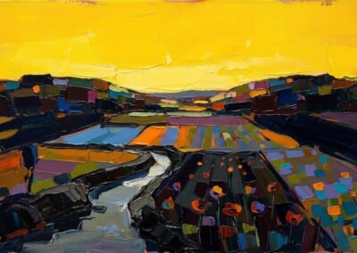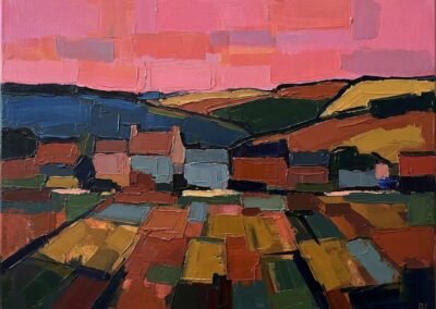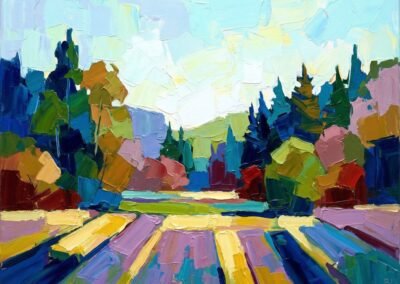Ce territoire est au cœur de son travail : une source d’inspiration constante, qu’elle transforme en paysages colorés, entre réalité et interprétation.