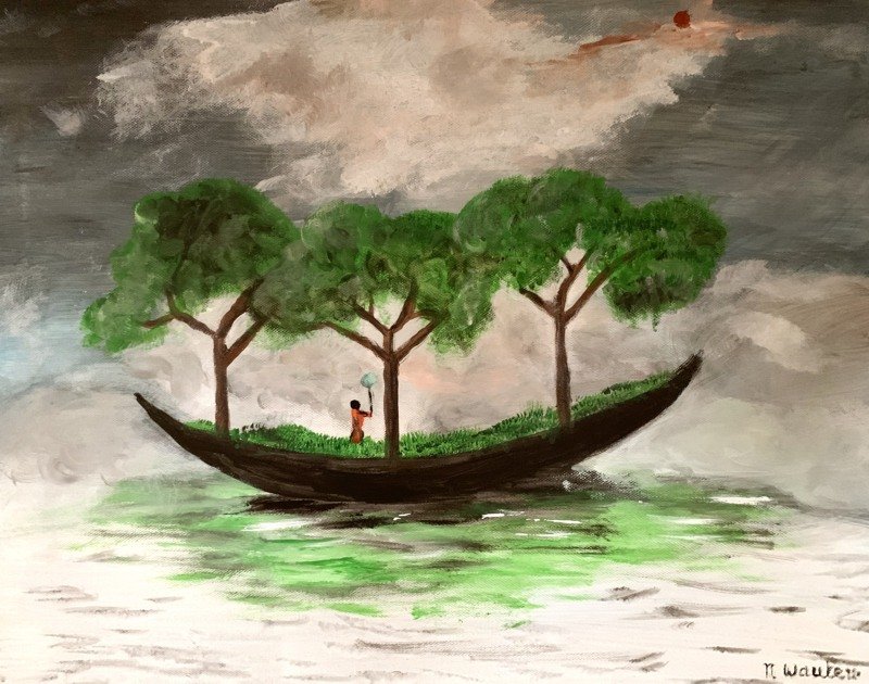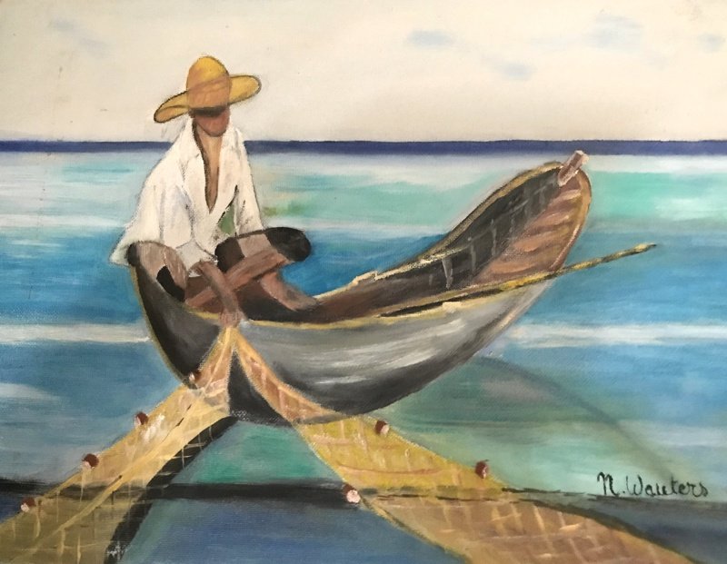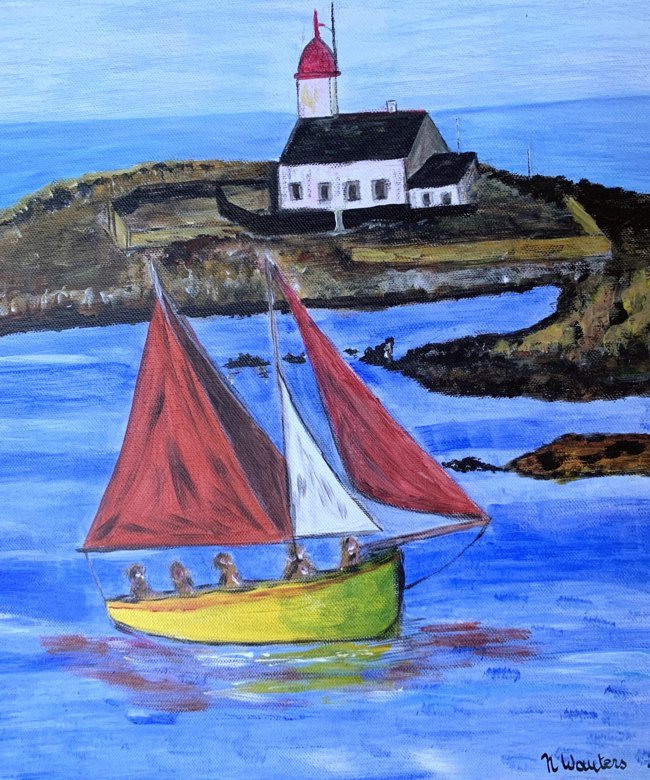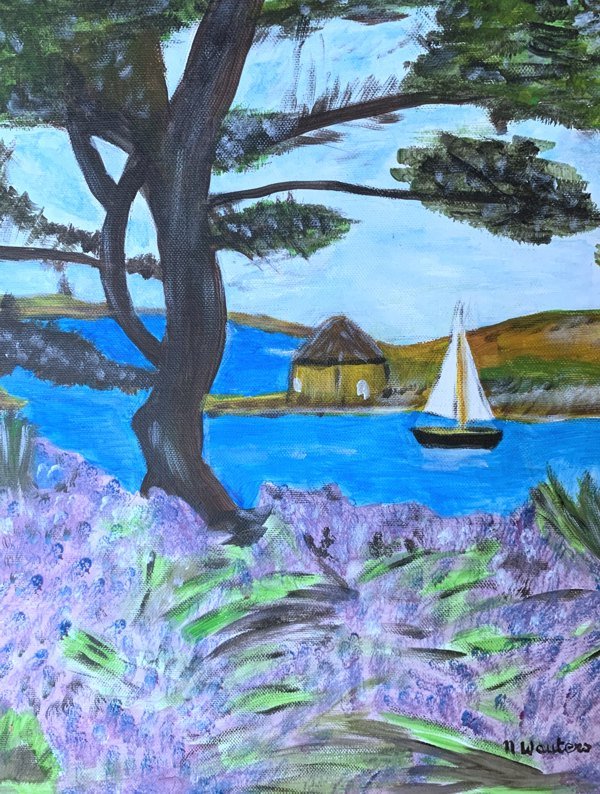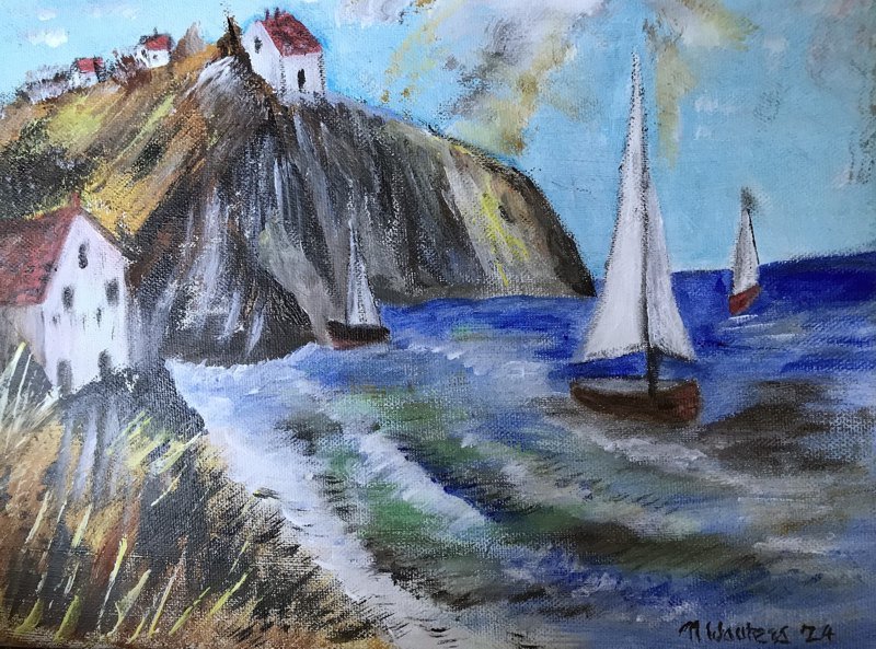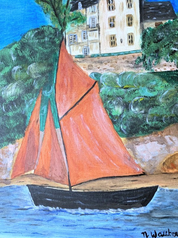 Ses tableaux racontent un univers sans tumulte, habité de paysages, de voiliers, de maisons, de ciels clairs. Un monde où tout paraît paisible, presque immobile, et pourtant vibrant de vie.