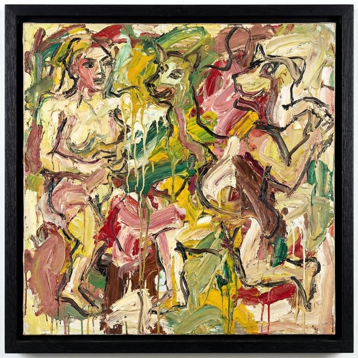 Anja Dallenbach «Die drei verwirrten Grazien (Les trois grâces déroutées) », Öl auf Leinwand, 90 x 90 cm, 2025. Auf der Rückseite mit « AnD » signiert.