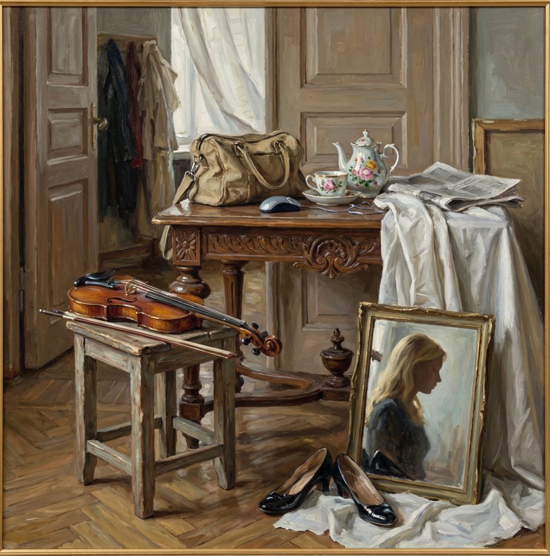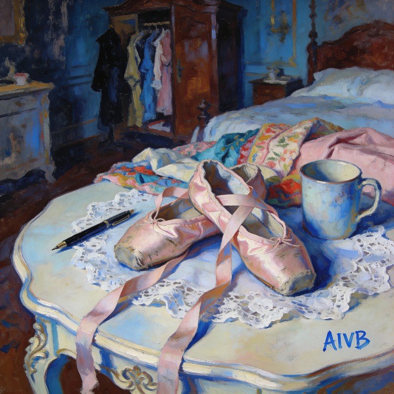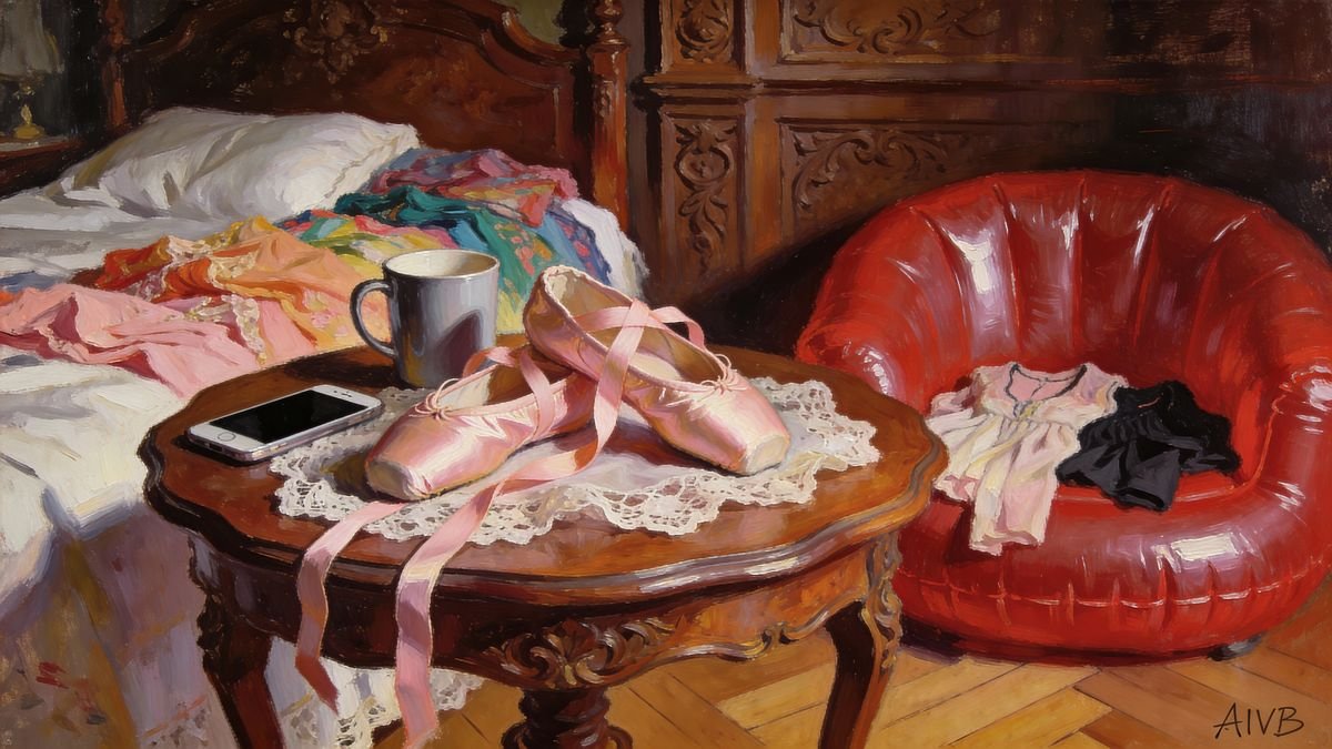 «Nach dem Tanz, Stillleben in meinem Zimmer», Ölgemälde auf Leinwand, 100 x 64cm – 2025. Signatur mit Photoshop hinzugefügt, Gemälde auf der Rückseite von Artemis Irenäus signiert und datiert. Dieses Ölgemälde ist das dritte einer Serie mit dem Titel «Im Schlafzimmer».