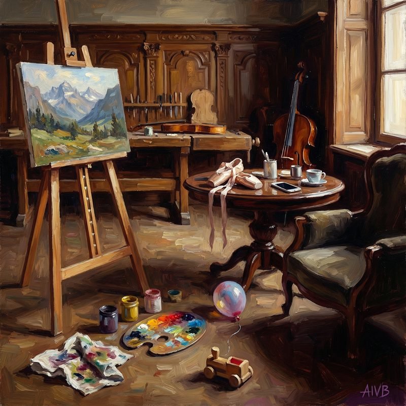«Das Kunstatelier in der ehemaligen Geigenbauwerkstatt meines Vaters, mit zwei Spielzeugen meiner Tochter». Ölgemälde auf Leinen, 80x80cm, 2025. Signatur auf der Rückseite. Signatur anschließend mit Photoshop auf der Vorderseite hinzugefügt.