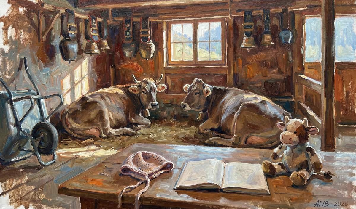 Details im Vordergrund: zwischen Tierkunst und Familienerinnerungen. Zwischen Skizzen und Kindheitserinnerungen: eine zauberhafte Auszeit im Stiegler Stall, gemalt im Januar 2026.